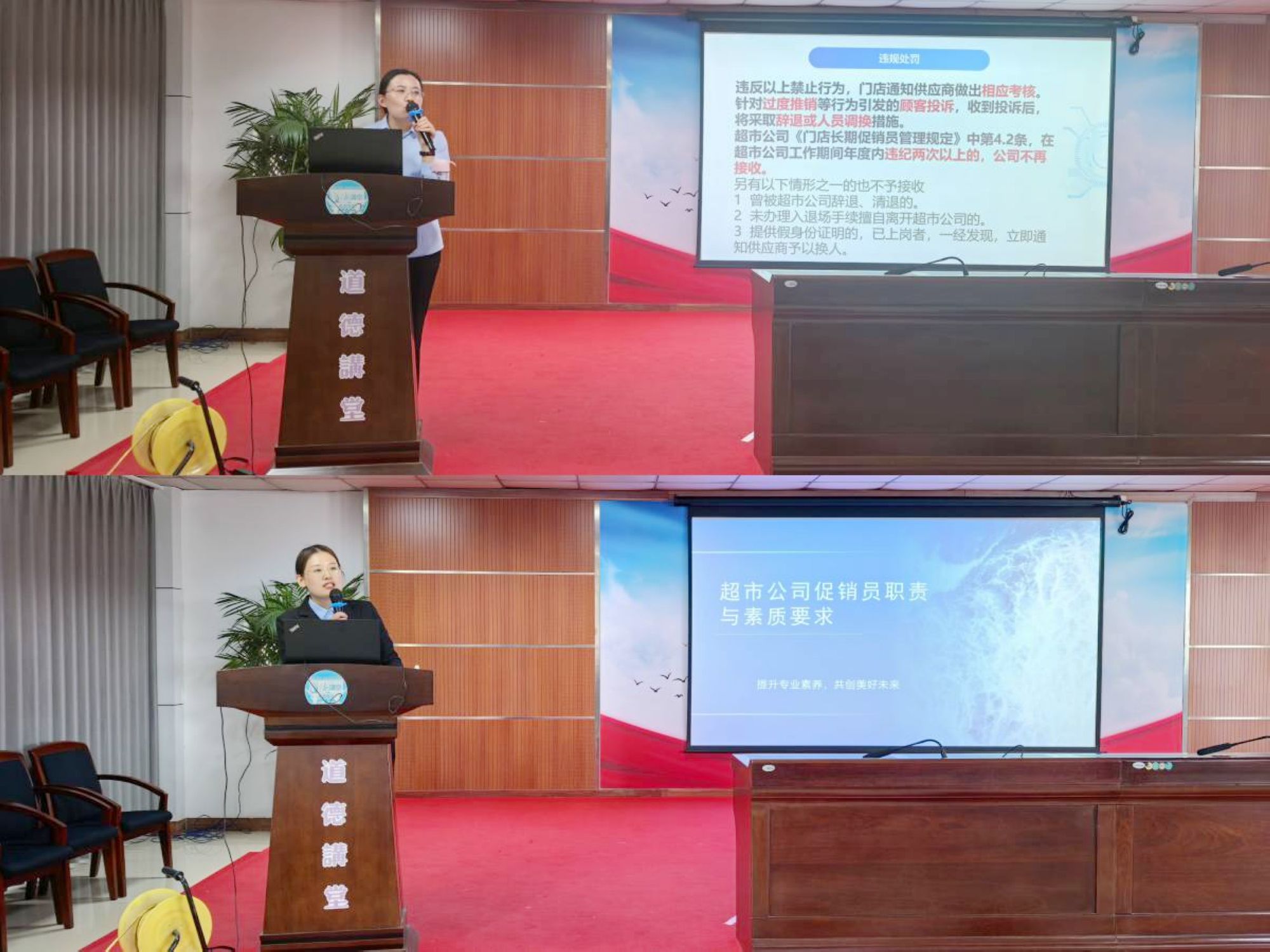 本次培訓(xùn)由購物中心河?xùn)|店助理張玉霞、購物中心齊魯園店助理李建梅擔(dān)任主講師,重點圍繞九州企業(yè)文化宣貫、促銷員職責(zé)與技能、禮儀素養(yǎng)與服務(wù)規(guī)范等方面展開。培訓(xùn)過程中,講師結(jié)合賣場真實案例,生動形象地講解了促銷員在工作過程中的行為規(guī)范。