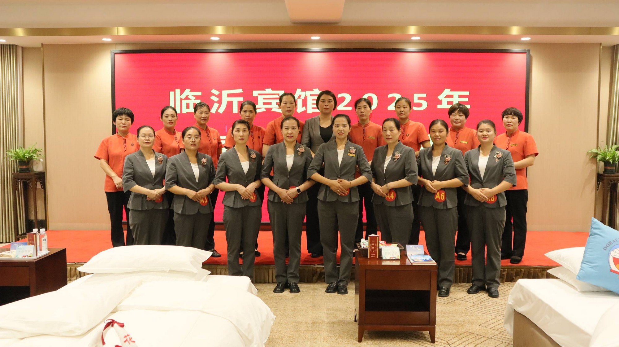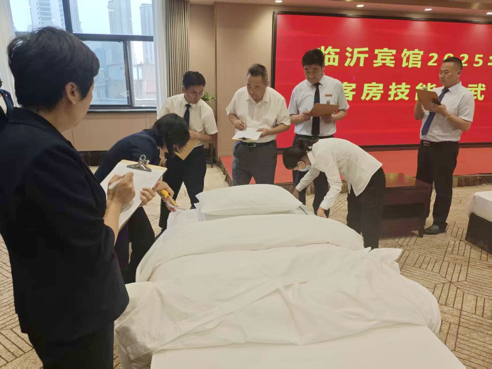 9月28日下午,臨沂賓館中式鋪床技能比武在沂蒙路店貴賓樓多功能廳舉行。本次技能比武分為中式鋪床、開夜床兩項,共有18名選手參加,以實操比拼展現(xiàn)服務專業(yè)素養(yǎng)。