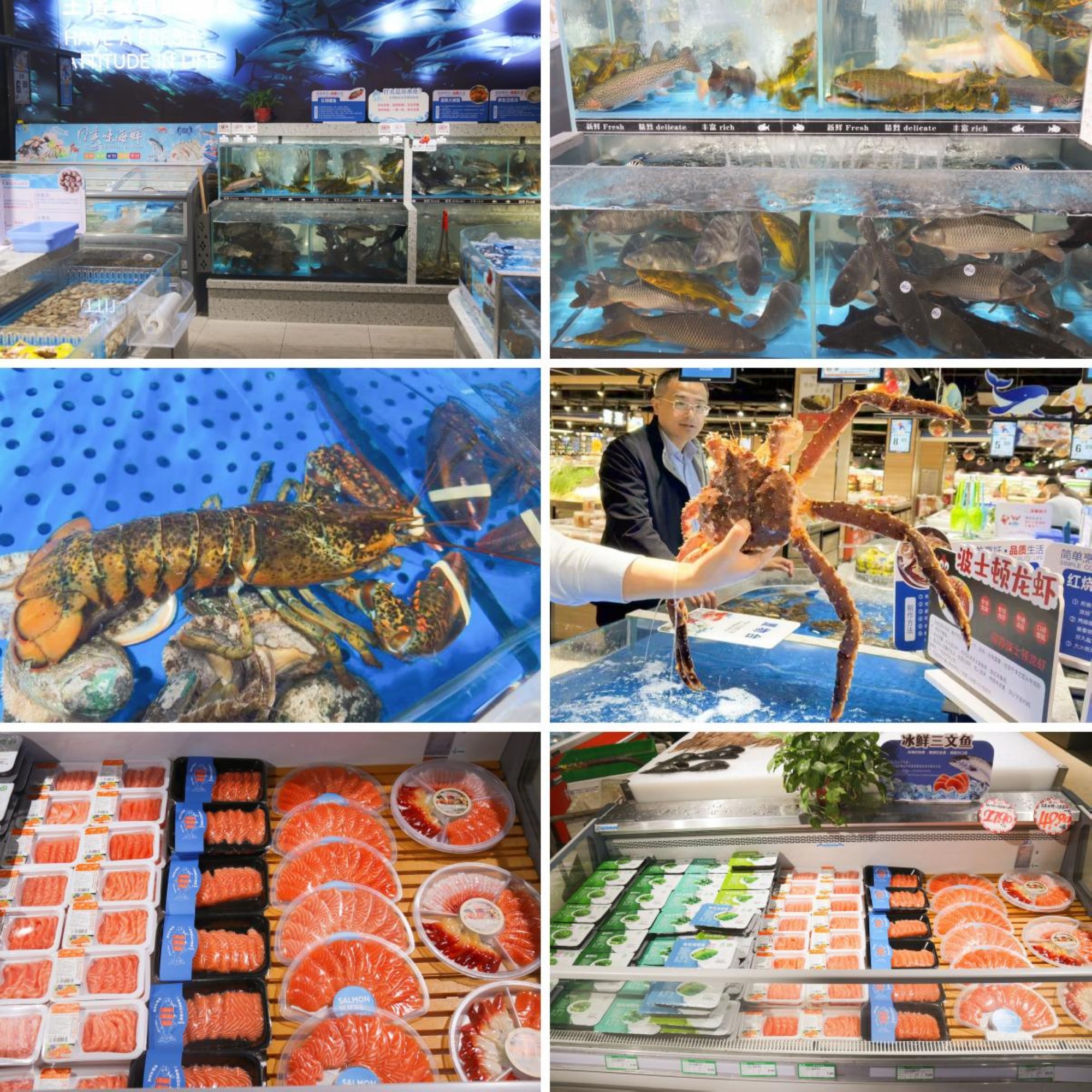 水產(chǎn)區(qū)設(shè)備全部煥新,引進帝王蟹、珍寶蟹、波士頓龍蝦、多寶魚、石斑魚、吊水虹鱒魚、冰鮮三文魚等鮮活水產(chǎn)品,并通過全程冷鏈直達門店,將新鮮送到消費者手中。