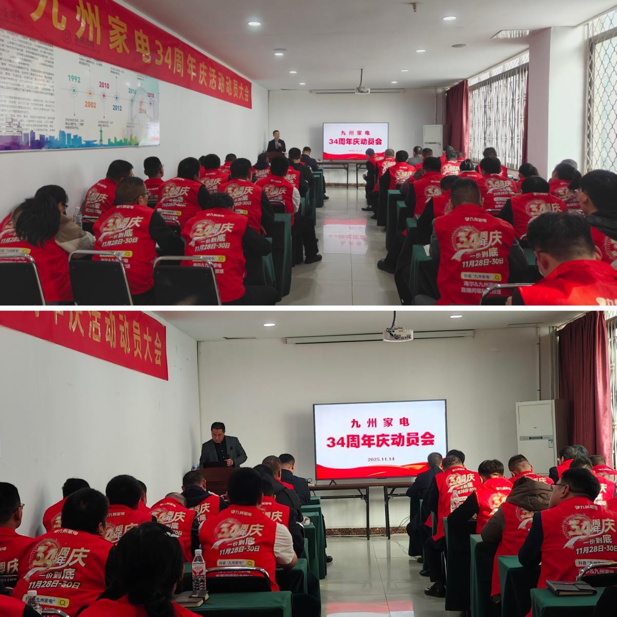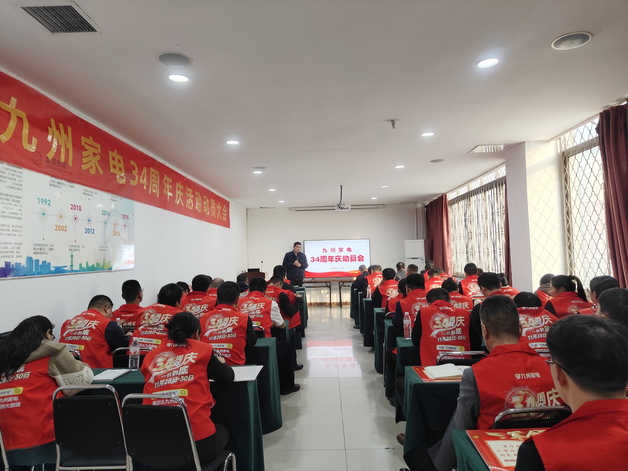 11月14日下午,九州家電34周年慶動員會在解放路店二樓會議室召開。九州家電主管及以上管理人員共50余人參加了會議。