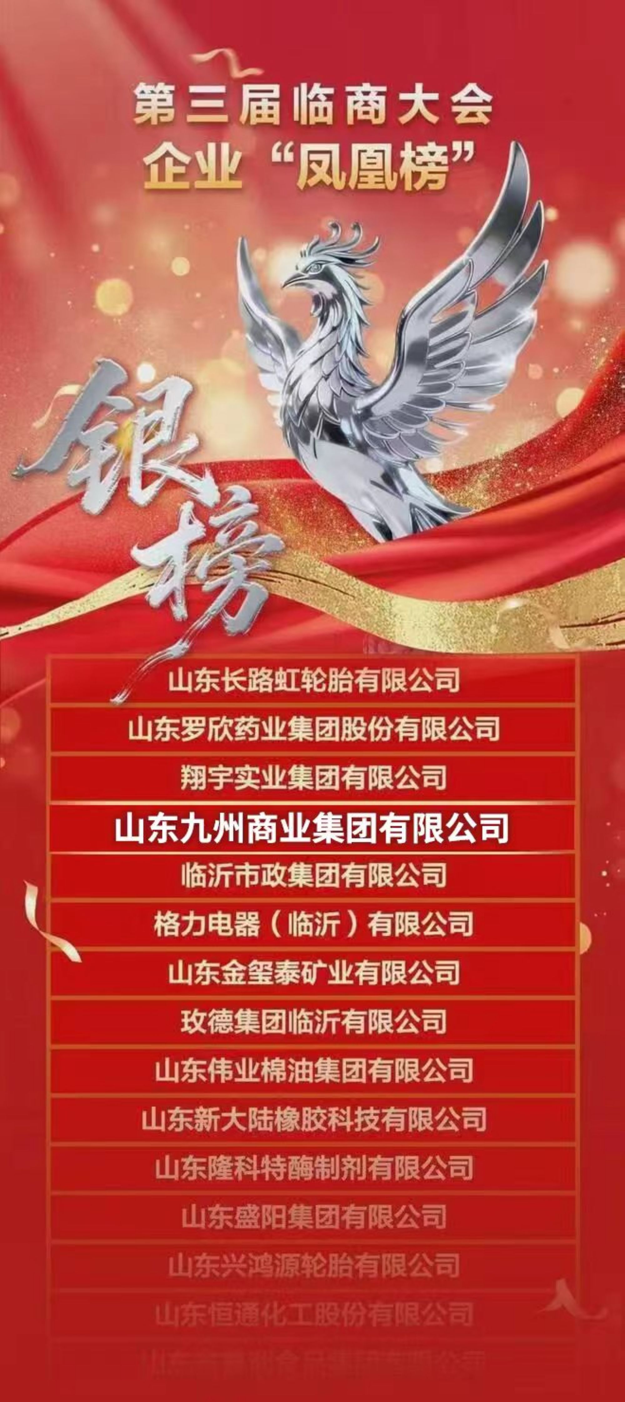 大會發(fā)布了臨沂市企業(yè)“鳳凰榜”,九州集團再度榮登“鳳凰銀榜”。